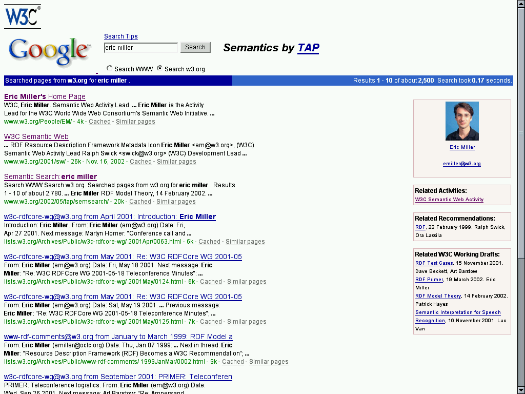 - FOAF (and FOAFCORP), Annotea, RSS 1.0, wordnet, MusicBrainz, Sherpa, RDFical (ICalendar)...