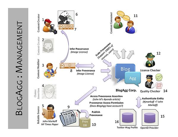 First, existing provenance solutions only address a small portion of the scenario and are not interlinked or accessible among one another. For each step within the News Aggregator scenario, there are existing technologies or relevant research that could solve that step. For example, one can properly insert licensing information into a photo using a creative commons license and the Extensible Metadata Platform. One can track the origin of tweets either through retweets or using some extraction technologies within twitter. However, the problem is that across multiple sites there is no common format and api to access and understand provenance information whether it is explicitly indicated or implicitly determined. To inquire about retweets or inquire about trackbacks one needs to use different apis and understand different formats. Furthermore, there is no (widely deployed) mechanism to point to provenance information on another site. For example, once a tweet is traced to the end of twitter there is no way to follow where that tweet came from.