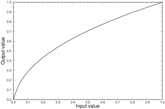 To deal with this non-linearity, the inverse power function (1/2.2) is applied to the RGB data before display, compensating for the non-linearities which will be introduced. Figure 5 shows a typical correction curve, which is a mirror image about the line Input = Output of the display non-linearity. (In other words, the display non-linearity curves down from a straight line and so the gamma correction curves up from that line [8].