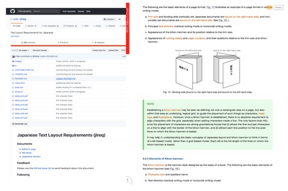 A few years ago, a group of experts from the Japanese publishing industry came together with others at the W3C to produce a set of requirements for support of Japanese layout. The resulting document, Requirements for Japanese Text Layout, known as 'jlreq' and published in both English and Japanese, was a resounding success, and was even published in book form in Japan.