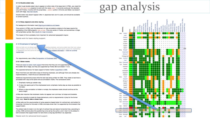 At the time of writing this, 33 languages need work for advanced publishing; 27 need work for basic features, and 1 doesn't work well on the Web. However, 41% of the cells in the matrix carry question marks: indicating that we need to do some research in order to know the status for that feature.