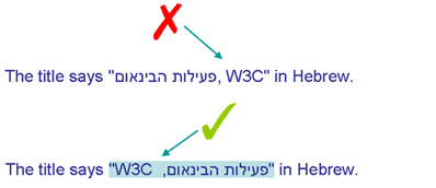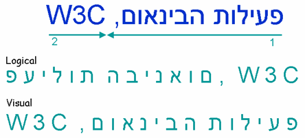 In the picture below, the phrase "פעילות הבינאום, W3C" (at the top in blue) appears as it would normally appear when displayed in a right-to-left paragraph. The numbered arrows show the reading direction. You read the sequences in the order of the numbers.