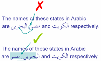 The reason for the failure is that, with a strongly typed right-to-left (RTL) character on either side, the bidirectional algorithm sees the neutral comma* as part of the Arabic text. It is interpreting the first two arabic words and the comma as a list in Arabic. In fact the comma is part of the English text, and should mark the boundary of two directional runs in Arabic.