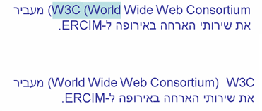 The order of the two Hebrew words is correct, but the text 'W3C' should appear on the left hand side of the quotation and the comma should appear between the Hebrew text and 'W3C'.