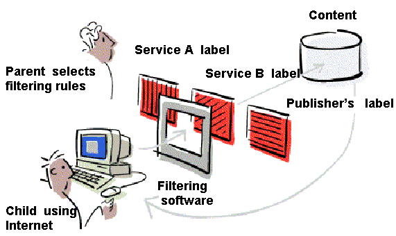 The first and most important distinction that PICS introduced is a separation between labeling and filtering. A label describes the content of something. A filter makes the content inaccessible to some audience. While both labeling and filtering may introduce social concerns, the concerns are somewhat different. More generally, there are six roles that could all be filled by different entities: