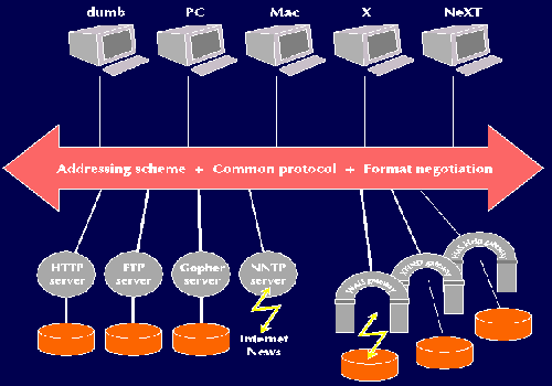 This takes development to the point where the general public became aware of it, and the rest is well documented. HTML, which was intended to be the warp and weft of a hypertext tapestry crammed with rich and varied data types, became surprisingly ubiquitous. Rather than relying on the extent of computer availability and Internet connectivity, the Web started to drive it. The URL syntax of the "http:" type became as self-describing to the public as 800 numbers.