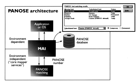 As shown in the accompanying illustration, the application or operating system requests a font match from the MAI, which first looks for an exact name match to the request. If none is found, it scans its exception database for custom overrides provided by the user. If there is no override, it uses the Core Mapper Services to locate the best substitute. A results dialog box shows the user the closest matching font and provides the option to change the suggested replacement (stored in the exceptions database). We should point out that, while any PANOSE implementation would probably want to make use of the Core Mapper Services, use of the MAI is optional.