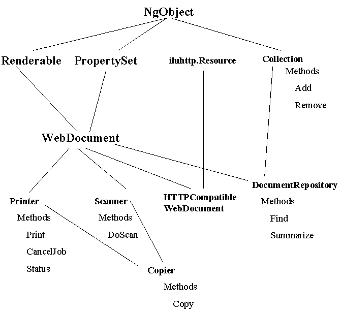For example, A WebDocument can implement its own method that allows both Rendering and Properties to be retrieved in a single call. Another example could be a new object type, MicrowaveOven, that not only is Renderable (can supply an image of what's cooking), but also adds methods to turn it on and off. Printers and Scanners could be defined as children of a WebDocument, and a Copier as a child of those. The following figure is illustrative of this sort of type evolution.