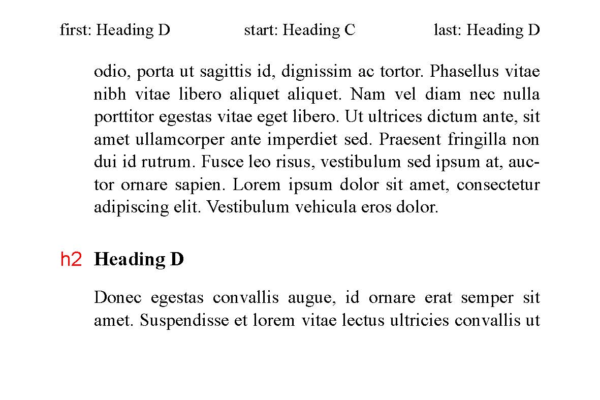 [CSS3PAGE] describes the sixteen page margin boxes which can be used for running headers and footers, but does not describe a mechanism for inserting content in those boxes. This module provides two methods for doing so. Named strings copy text for reuse in margin boxes. Running elements move elements (complete with style and structure) from the document to margin boxes.