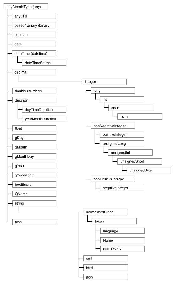 David Peterson; Sandy Gao; Ashok Malhotra; Michael Sperberg-McQueen; Henry Thompson; Paul V. Biron et al. W3C XML Schema Definition Language (XSD) 1.1 Part 2: Datatypes. 5 April 2012. W3C Recommendation. URL: http://www.w3.org/TR/xmlschema11-2/