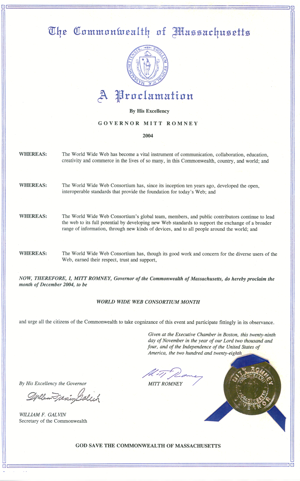 In a proclamation issued 1 December, Massachusetts Governor Mitt Romney has declared December 2004 to be World Wide Web Consortium Month. Read by COO Steve Bratt at the W3C Tenth Anniversary Celebration, the proclamation cites W3C for "its good work and concern for the diverse users of the Web" and says W3C "earned their respect, trust and support." See the official document and read the full text.