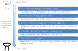 Governmental bodies thus realize that, besides responding to external pressures, the actual justification for opening data assets is that public bodies could directly reap tangible benefits, resulting in efficiency, effectiveness and hive of public sector innovation. Some illustrative examples are provided in the figure below, along a continuum representing the degree of maturity reached by a public body in the management of Open Data programs.