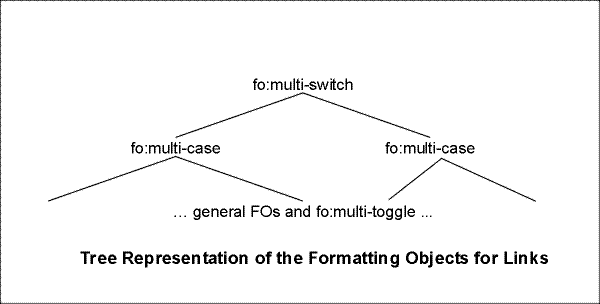 The fo:multi-switch wraps the specification of alternative sub-trees of formatting objects (each sub-tree being within an fo:multi-case), and controls the switching (activated via fo:multi-toggle) from one alternative to another.